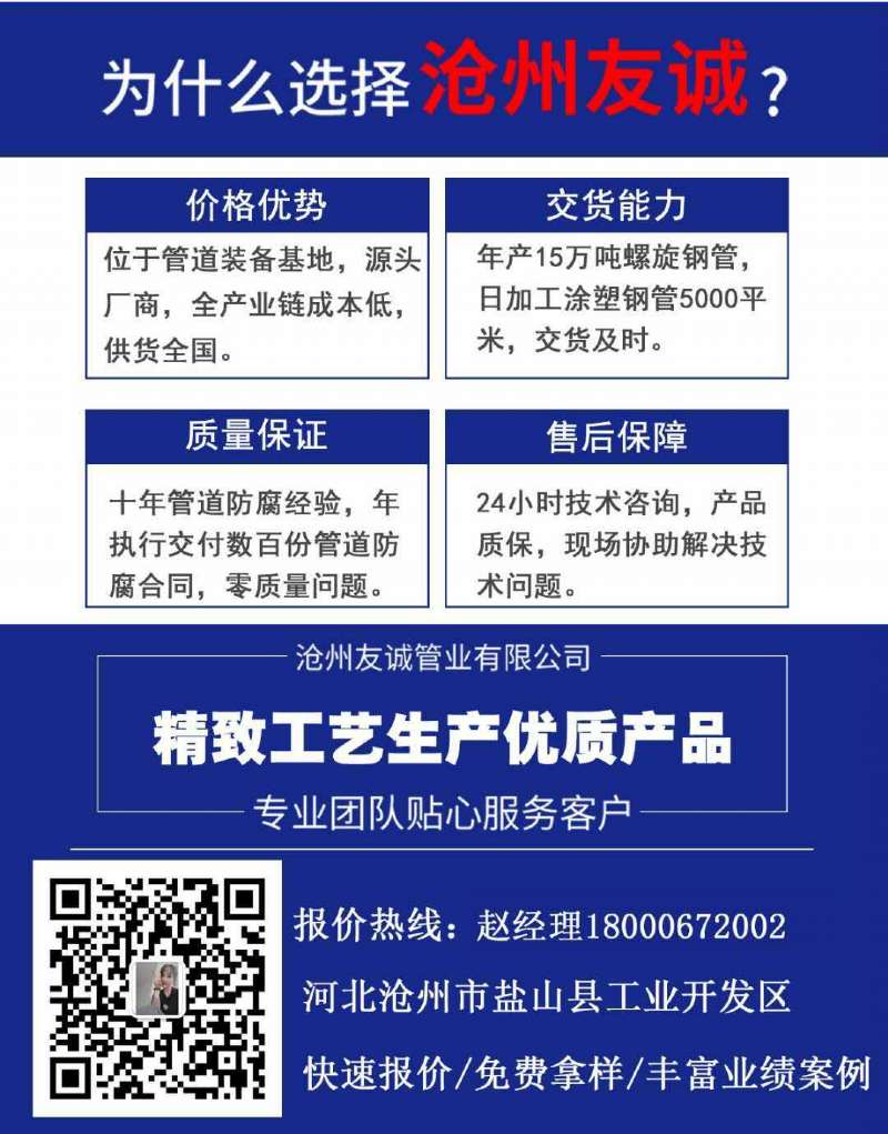 螺旋鋼管首選滄州友誠管業(yè)有限公司,我們本著誠信為本的原則,以質(zhì)量求生存,以信譽得發(fā)展的企業(yè)經(jīng)營理念,不斷開拓進取。在激烈的市場競爭中,憑借良好的合作關(guān)系公司茁壯發(fā)展,在持續(xù)改進、追求卓越不斷進取、永不滿足的信念,企業(yè)在不斷創(chuàng)新中求發(fā)展,個人靠創(chuàng)新精神求進步,日積月累,量變到質(zhì)變,每天的一小步,就是企業(yè)將來的一大步,點滴的匯集,使公司成長的實力雄厚的流通企業(yè)。服務(wù)三保:保證質(zhì)量、